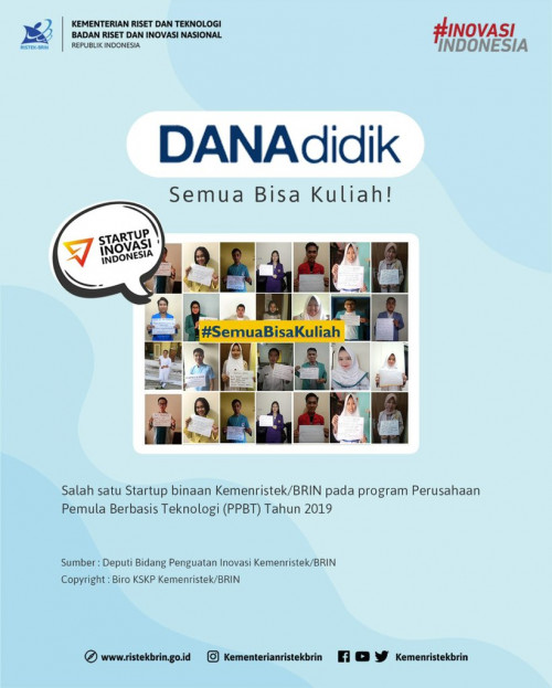 Salah satu startup binaan Kemenristek/BRIN yang memberikan manfaat bagi mahasiswa dari seluruh Indonesia agar #SemuaBisaKuliah. ? DANAdidik adalah perusahaan finansial teknologi (fintech) khusus untuk pembiayaan pendidikan (kuliah, pelatihan, dan sertifikasi) yang mempertemukan lender (pemberi pinjaman dana) dengan mahasiswa yang membutuhkan dana untuk menempuh jenjang pendidikan tinggi.?