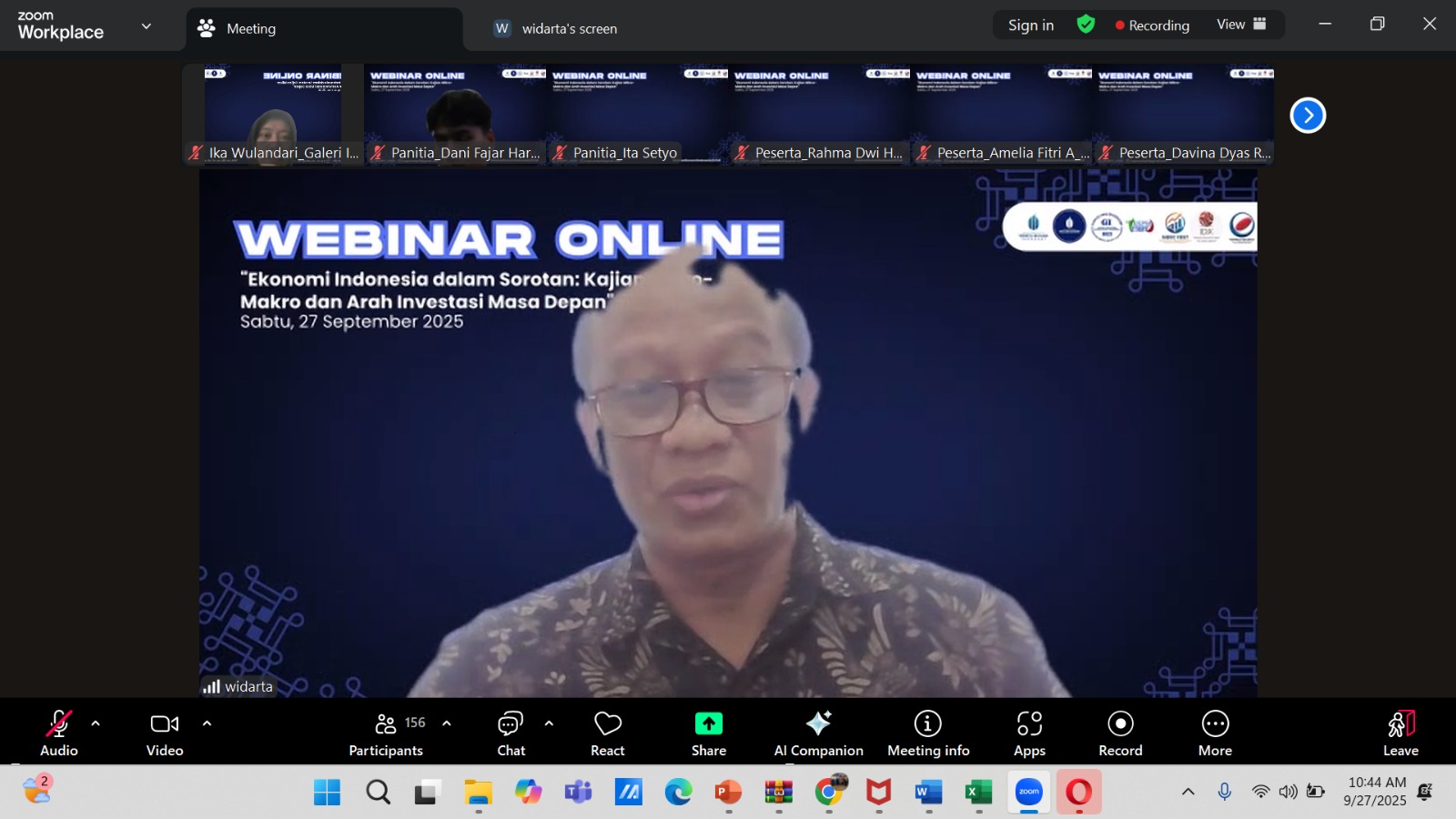 Webinar kali ini menghadirkan dua narasumber kompeten di bidang ekonomi dan pasar modal, yakni Widarta, S.E., M.M., CDMP (Dosen Fakultas Ekonomi UMBY) dan Desi Wahyuni, S.E., M.M. (Executive Trainer Phintraco Sekuritas). Webinar yang berlangsung secara daring ini diikuti oleh kurang lebih 150 peserta dari berbagai latar belakang, termasuk mahasiswa, akademisi, dan praktisi ekonomi. Acara ini dipandu langsung oleh Dina Karista selaku Ketua KSPM UMBY, dan diketuai oleh Davina Shafa Alivia Zahra sebagai Ketua Panitia.