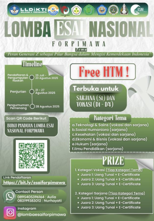 Dalam rangka menyambut HUT Kemerdekaan Republik Indonesia ke-80 dan sebagai wadah ekspresi serta kontribusi pemikiran mahasiswa Indonesia, Forum Pimpinan Perguruan Tinggi Bidang Kemahasiswaan (FORPIMAWA) Wilayah DIY menyelenggarakan kegiatan "Lomba Esai Nasional FORPIMAWA 2025" dengan tema "Peran Generasi Z sebagai Pilar Bangsa dalam Mengisi Kemerdekaan Indonesia".