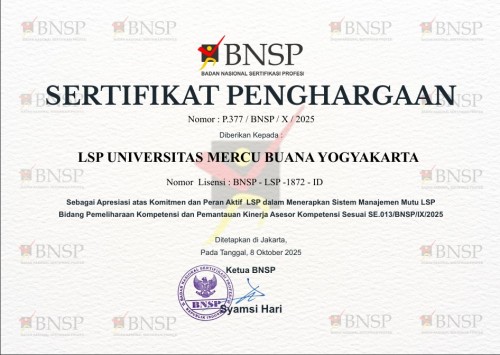 Lembaga Sertifikasi Profesi (LSP) P1 Universitas Mercu Buana Yogyakarta (UMBY) menerima Sertifikat Penghargaan dari Badan Nasional Sertifikasi Profesi (BNSP). LSP UMBY mendapat penghargaan sebagai apresiasi atas komitmen dan peran aktif LSP dalam menerapkan sistem manajemen mutu LSP bidang pemeliharaan kompetensi dan pemantauan kinerja asesor.