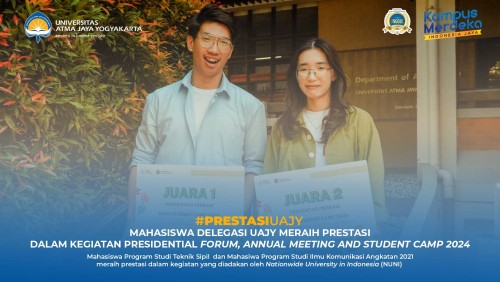 Dua mahasiswa delegasi UAJY meraih prestasi membanggakan dalam kegiatan Presidential Forum, Annual Meeting and Student Camp 2024 yang diselenggarakan oleh Nationwide University Network in Indonesia (NUNI) pada 22-26 Agustus 2024 di Digital Learning Center Building (DLCB) Universitas Sumatera Utara.