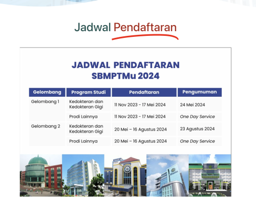 Program SBMPTMu ini mencakup 122 Perguruan Tinggi Muhammadiyah/ ‘Aisyiyah (PTMA) yang tersebar di seluruh Indonesia dan menawarkan lebih dari 500 program studi. Ini menjadi peluang emas bagi calon mahasiswa untuk bisa diterima di program studi yang diimpikan. Adapun pendaftarannya terbagi menjadi dua gelombang di tahun 2024 ini.