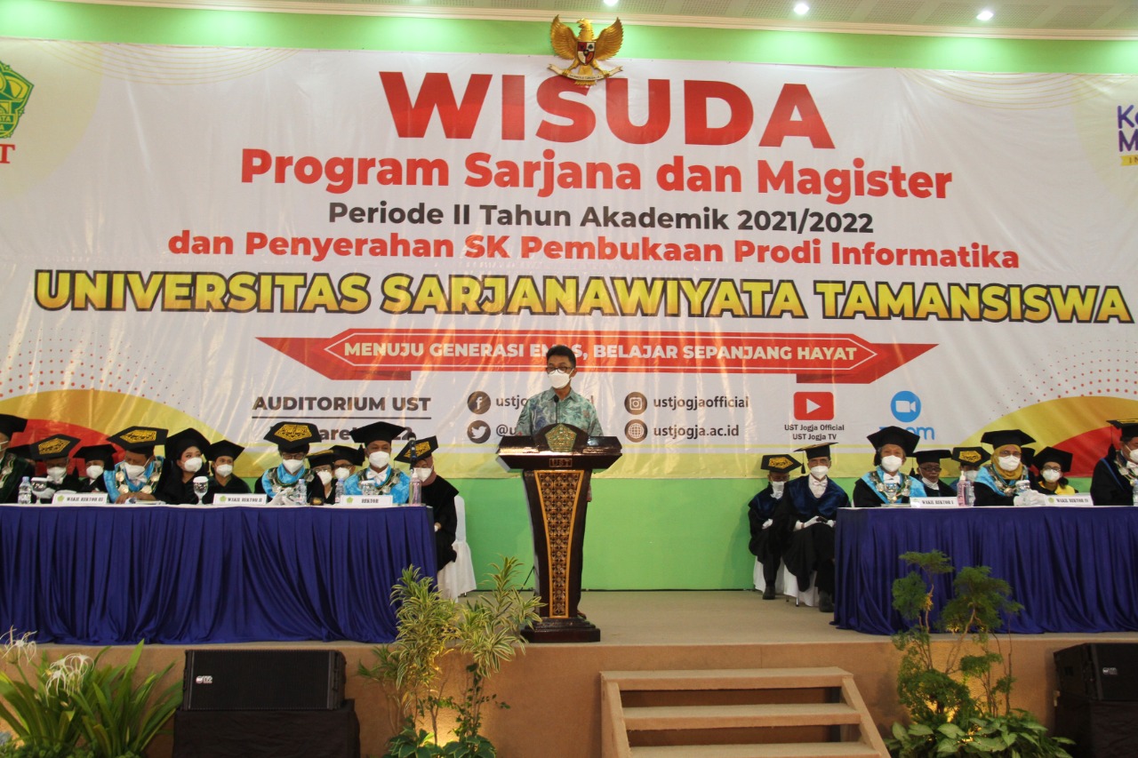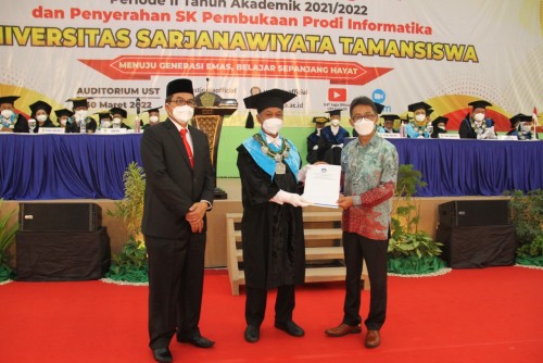 Yogyakarta, 30 Maret 2022. Bertempat di Auditorium Lantai 4 Gedung Pusat Universitas Sarjanawiyata Tamansiswa (UST), Kepala Lembaga Layanan Pendidikan Tinggi (LLDikti) Wilayah V Yogyakarta menyerahkan Salinan Surat Keputusan Menteri Pendidikan, Kebudayaan, Riset, dan Teknologi Republik Indonesia Nomor 212/E/O/2022 tentang Izin Pembukaan Program Studi Informatika program Sarjana pada Universitas Sarjanawiyata Tamansiswa. Penyerahan SK tersebut bersamaan dengan acara Wisuda Program Sarjana dan Magister Periode II Tahun Akademik 2021/2022.