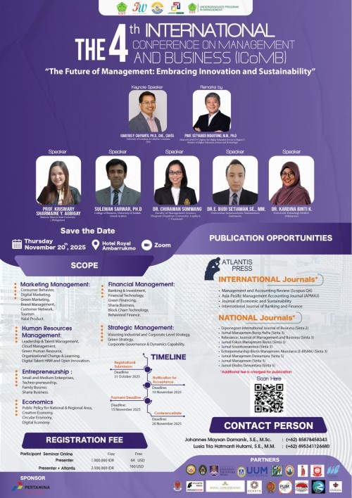 Universitas Sarjanawiyata Tamansiswa (UST) kembali menghadirkan The 4th International Conference on Management and Business (ICoMB), sebuah forum ilmiah bergengsi yang mempertemukan akademisi, peneliti, dan praktisi bisnis dari berbagai negara untuk berbagi gagasan dan hasil penelitian terkini di bidang manajemen dan bisnis.