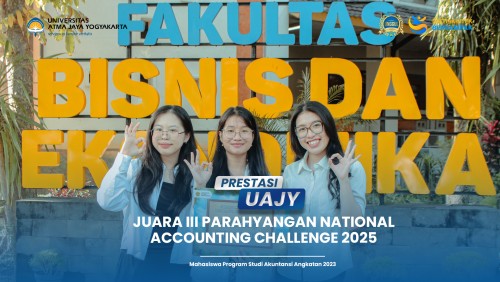 Tim Olimpiade Akuntansi Atma Jaya Yogyakarta (TOAA) kembali menorehkan prestasi membanggakan. Tiga mahasiswa Program Studi Akuntansi Fakultas Bisnis dan Ekonomika angkatan 2023, yaitu Vivian Kwek, Denisha Kosasih, dan Nanda Citra Christy Halawa, berhasil meraih Juara 3 dalam ajang Parahyangan National Accounting Competition 2025 yang diselenggarakan oleh Universitas Katolik Parahyangan di Bandung.
