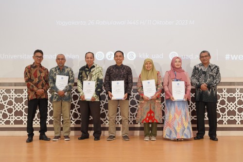 Lima dosen Universitas Ahmad Dahlan (UAD) Yogyakarta menerima Surat Keputusan (SK) Kenaikan Jabatan Akademik sebagai Guru Besar. Mereka adalah Prof. Anton Yudhana, S.T., M.T., Ph.D. Guru Besar Bidang Ilmu Teknik Elektro, Prof. Dr. Imam Riadi, S.Pd., M.Kom. Guru Besar Bidang Ilmu Sistem Informasi, Prof. Dr. apt. Nanik Sulistyani, M.Si. Guru Besar Bidang Ilmu Farmasi, Prof. Dr. Ir. Siti Jamilatun, M.T. Guru Besar Bidang Ilmu Energi, serta Prof. Sugiyarto, S.Si., M.Si., Ph.D. Guru Besar Bidang Ilmu Matematika Terapan. Hal tersebut berdasarkan keputusan Menteri Pendidikan, Kebudayaan, Riset dan Teknologi yang ditetapkan pada tanggal 1 Juli 2023 tentang kenaikan jabatan dosen menjadi profesor.