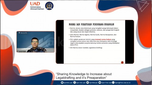 Dewan Perwakilan Mahasiswa (DPM) Fakultas Ekonomi dan Bisnis (FEB) Universitas Ahmad Dahlan (UAD) menyelenggarakan webinar nasional dengan tema “Sharing Knowledge to Increase About Legal Drafting and it’s Preparation” secara daring pada Minggu, (24-10-2021). Pelaksanaan Webinar tersebut selain dalam rangka kewajiban memenuhi program kerja sebagai lembaga legislatif, juga untuk mengetahui mengenai tata cara pembentukan perundang-undangan. Hadir sebagai narasumber yakni Ilham Yuli Isdianto, S.H., C.L.A., C.M.B. Dosen Fakultas Hukum UAD dan Nurfaqih Irfani, S.H., M.H. selaku Direktorat Jenderal Peraturan Perundang-undangan Kemenkumham Republik Indonesia.